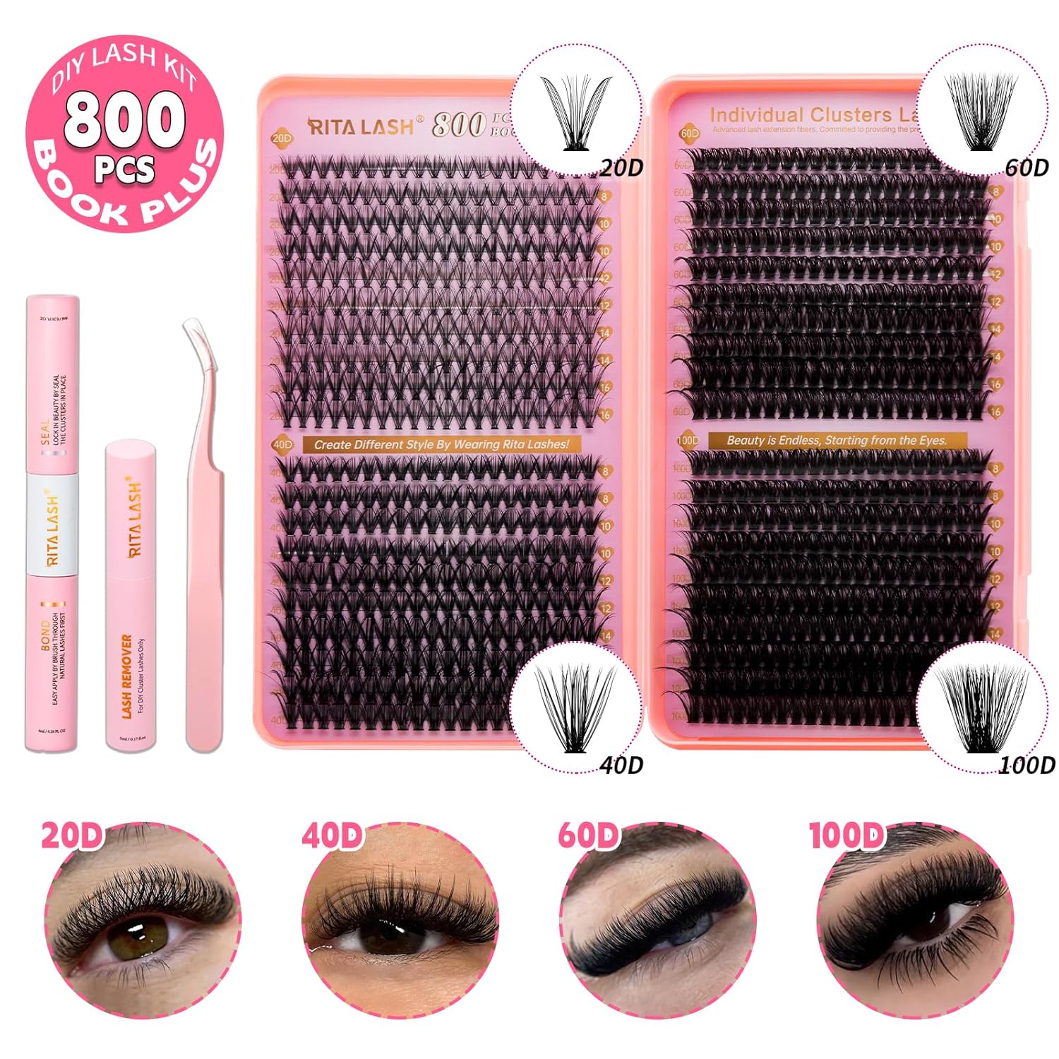 💖RITALASH DIY Lash Extension Kit Book Set – 800PCS Cluster Lashes (20D+40D+60D+100D)